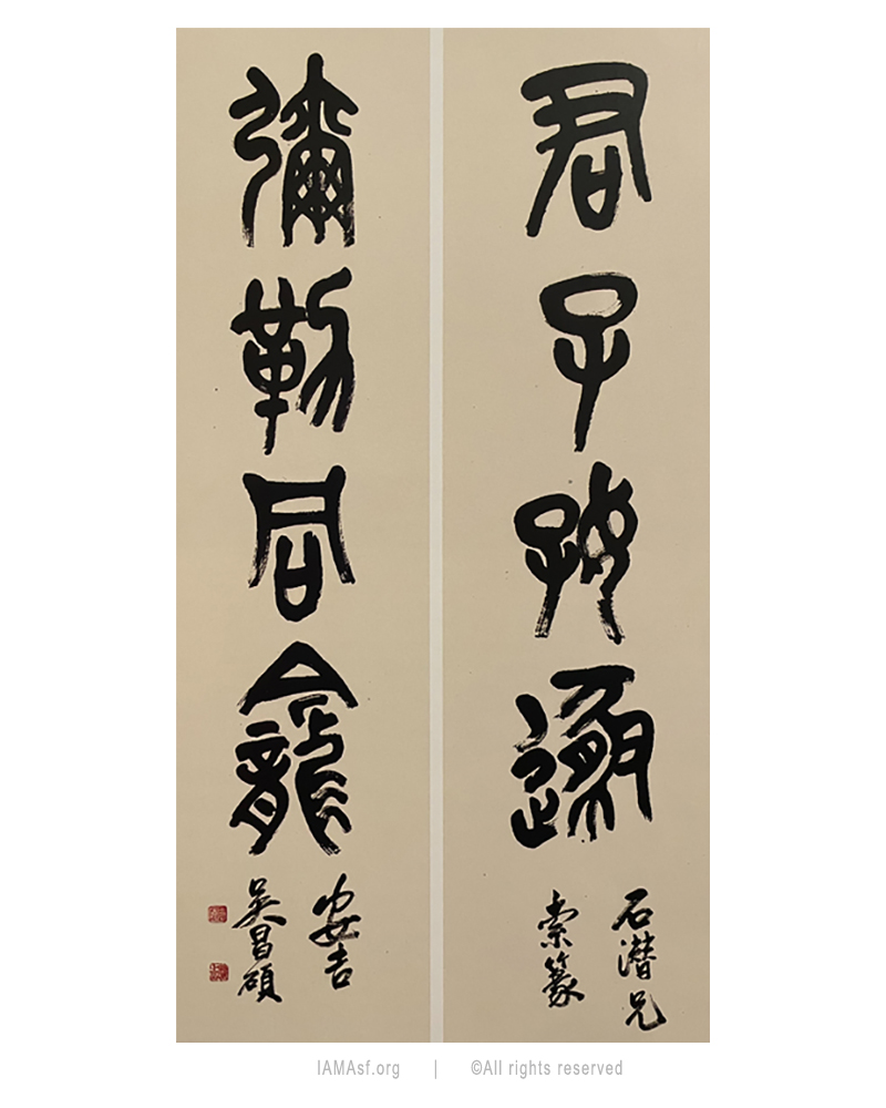 This couplet by Wu Changshuo is written on a pair of scrolls in the calligraphic style of inscriptions on ancient bronze objects. One scroll is on the left side of the Longevity Peaches painting, and the other scroll is on the right side. This is a marvelous calligraphic work of the highest level. When it comes to calligraphy in the style of inscriptions on ancient bronze objects. Wu Changshuo can rightly be called the preeminent calligrapher in all of Chinese history. The main characters in the inscription style in the couplet are (right side) 君子好遁 and (left side) 彌勒同龕 .