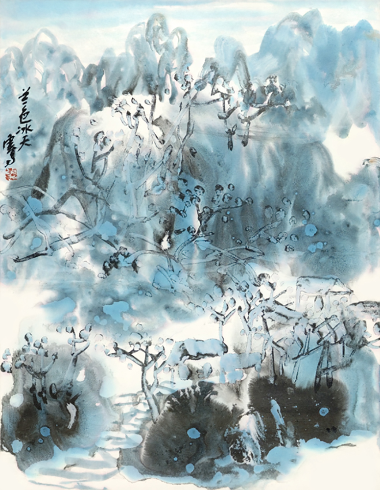 This painting called “Landscape of Icy Blue” or “Lan Se Bing Tian” may seem simple on the surface. However, after one attempts to copy it, one will know how deep it truly is. From the blue charm of the ink-and-wash painting, it is not difficult to see the level of an artist’s accomplishment and talent. The mountains and trees were painted in the same watery ink color as the sky. Wondrous charm flows within the surreal depictions. The attractive theme and colors fuse naturally into an integral whole. The interplay of the real and the surreal together with unexpected variations produces a charming effect throughout the entire painting.