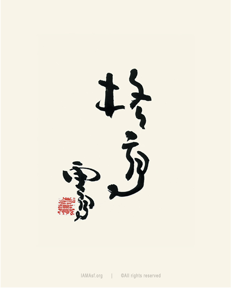 The two Chinese characters in this work of calligraphy mean “Noble Manner.” They manifest a calligraphic style that is different from other styles in the world. The artist created this work of calligraphy free of any mental attachment or artificiality and without any pre-existing calligraphic plan or intent. His writing hand was unfettered, and his heart was free. All movements of the brush were spontaneous. A natural charm that springs from childlike innocence were attained. This type of impromptu wielding of the brush can be described as the cursive writing style of a child. The term “Noble Manner” means that one should have an elevated and broad manner, an all-inclusive magnanimity. We should let others, rather than ourselves, have that which is beneficial so that we may attain a noble moral character, and we should cultivate a mentality of non-attachment in order to develop our virtue.