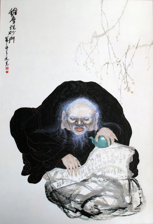 The elderly person in this painting called “Vimalakiri Expounds Wonderful Teachings” has a noble and sincere expression, an appearance that transcends the mundane, and an air of great compassion. One can easily see that He is definitely not of this mortal world. This virtuous being of utmost holiness is venerable Vimalakirti, one of the greatest and most famous persons in Buddhism. The painting demonstrates extraordinary artistic skills and conception, and has a graceful arrangement. In short, it makes people feel at ease and comfortable. Only through skills applied with a completely unfettered hand and mind can one reach this state of mastery in which calligraphy and painting merge.