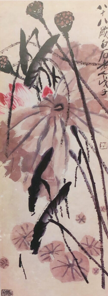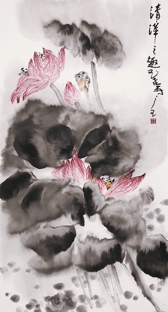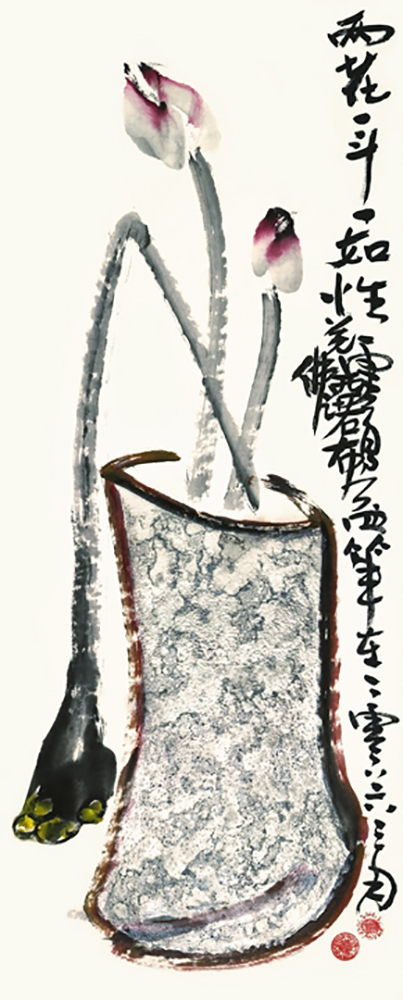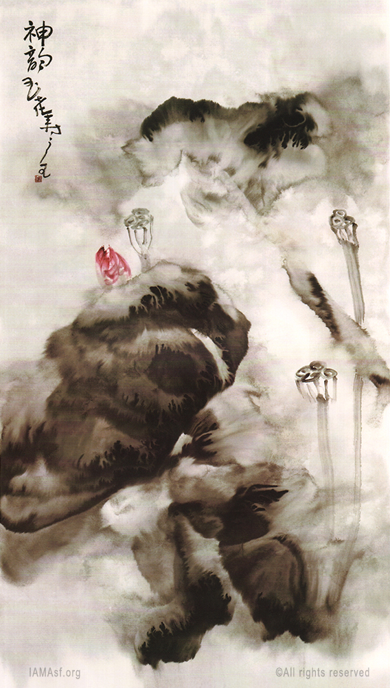 This flower looks simple but has clearly defined brush touches that are seasoned and natural. The flower stem, the three-dimensional feeling, and even the inscription all demonstrate the use of emptiness as form and the use of form to correspond emptiness. The whole painting contains an atmosphere of marvelous charm. The lotus flower paintings of Yu Hua Shouzhi Wang (Dr:...