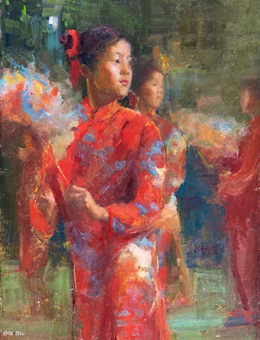 Ni Zhu, Girl with the Paper Dragon, oil on panel, 16 x 12 in.