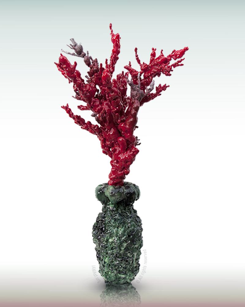 “Parched Ancient Coral” was hand-sculpted and painted in oil colors by Professor Yu Hua Shouzhi Wang. Its shape and colors are even more genuine-looking and beautiful than those of real coral from the bottom of the sea or parched iSlands. When touching this sculpture, it obviously feels like coral that has been eroded through immersion in water. One cannot help but marvel that Yu Hua Shouzhi Wang has recreated throuch her brushwork coral with the texture of having been soaked and eroded for millions of years. Such coral is difficult to find even at the bottom of the sea. Its appeal is even further enhanced with the matching hand-sculpted vase called “Lucui Qilang (Emerald Green Fine Jade).” This entire hand-sculpted and hand-painted faux coral has an air of elegance and refinement, surpassing the beauty of natural coral. With unparalleled works of art such as this, it is no wonder the artistic accomplishments of Yu Hua Shouzhi Wang were recognized as “treasures of the world.” (Please see the United States Congressional Record for details.)