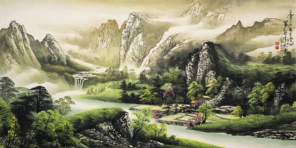 The splash-ink technique is merged with the center brush-tip technique to create realistic paintings of landscapes.