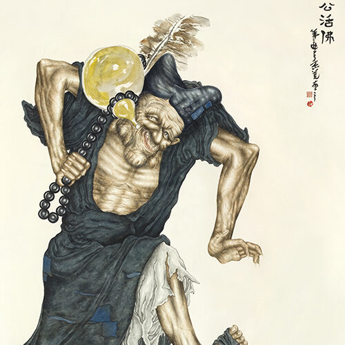 “Monk Jigong” is a figure in Buddhism, a holy Arhat known to almost everyone in China. He applied his vast supernatural powers to benefit the public. Through his boundless dharma powers, he helped and saved people, punished evil, and promoted goodness. In China, there have been many movies, television productions, and writings in which he is highly praised. With the wondrous touch of his brush, the artist applied the fine brushwork technique to realistically reveal details of the skin, meridians, and veins of Monk Jigong. Combining these two elements of fine brushwork and realism, the artist vividly portrayed the image of this figure who lived as a beggar in his daily life.
