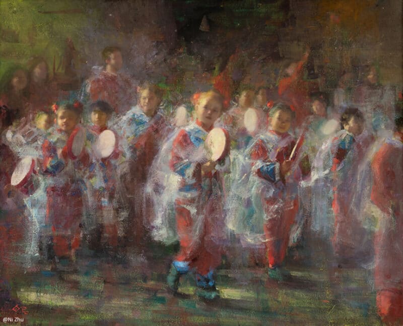 Ni Zhu, Parade in the Rain, oil on linen, 26 x 32 in.
