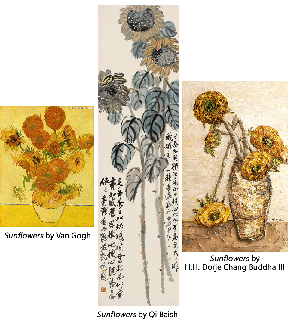 Some art critics compared the works of Van Gogh and Qi Baishi to see which of them reached a higher level of accomplishment. They concluded that both have their own merit, both are undefeated champions in the art and both reached the pinnacle of artistry. Recently, some art critics also brought up the oil painting Sunflowers and the ink-wash painting Sunflowers, both created by H.H. Dorje Chang Buddha III, and gave them rave reviews. They went on to compare the works by Vincent van Gogh and Qi Baishi with the works by H.H. Dorje Chang Buddha III, trying to establish which of the three artists is the champion of the champions. The result of comparing the works by Van Gogh, Qi Baishi, and H.H Dorje Chang Buddha III is tremendously inspiring.