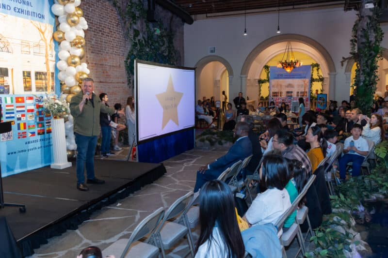 San Francisco District Supervisor Matt Dorsey speaks during the 2025 International Youth Art Contest awards ceremony, highlighting the importance of youth arts programming and recognizing the International Art Museum of America as a hidden cultural gem in the heart of the city. Photo Credit: IAMA